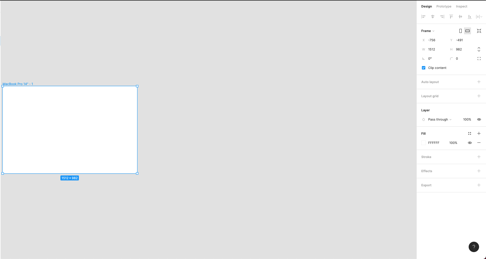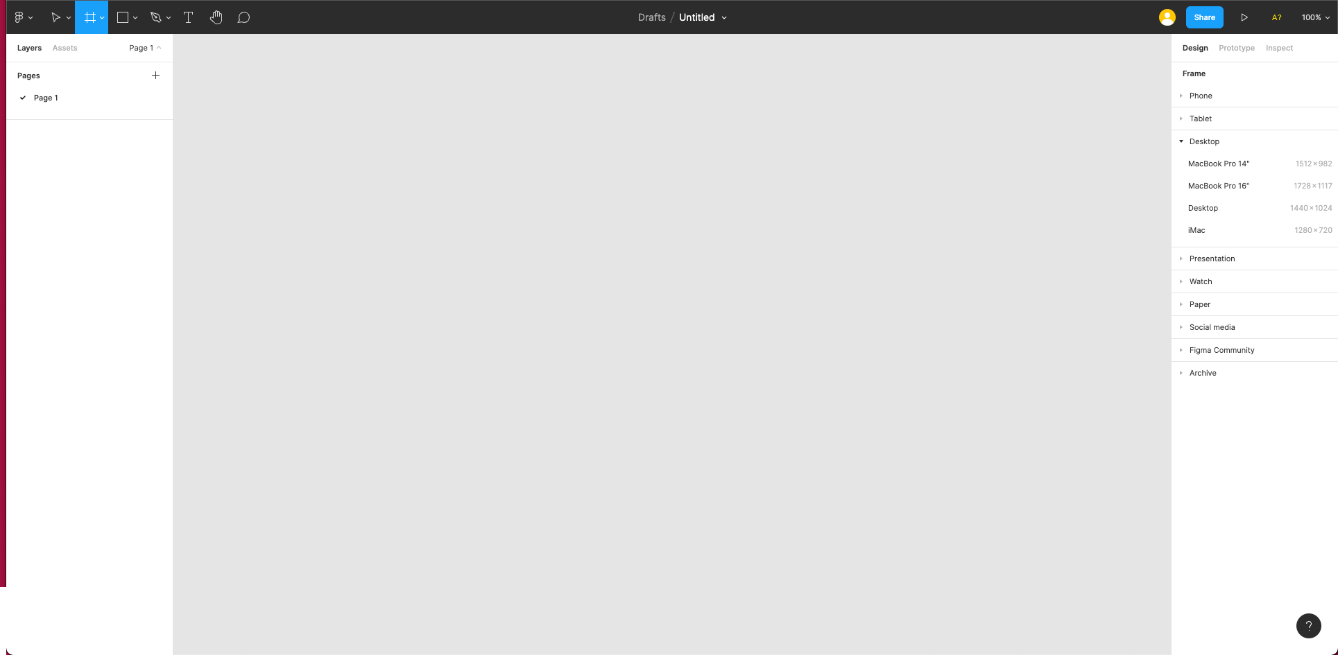 2. 상단 중간에 파일 이름을 정해두고, 상단 탭의 3번째를 눌러서 작업물의 사이즈를 정한다. 웹이라면 Desktop, 휴대폰 등 알맞게 지정하면 된다. 반응형 디자인을 생각할 때 도 똑같이 만들 수 있다.
